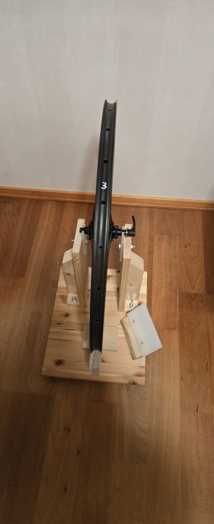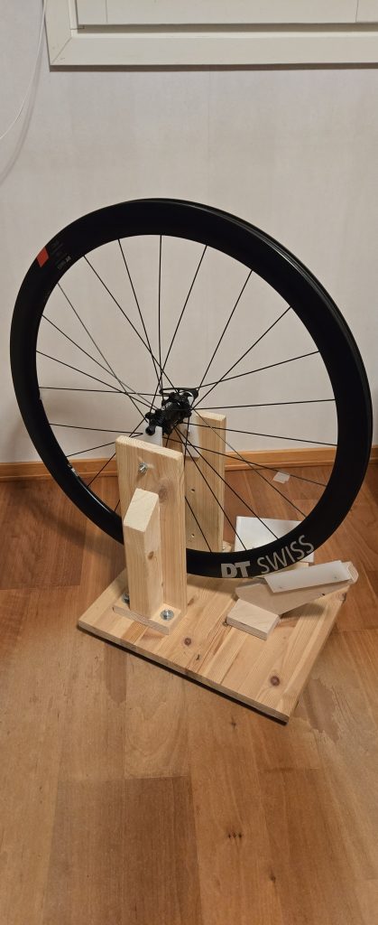Kuitukiekkoprojekti nytkähti jälleen eteenpäin. Itse asiassa se nytkähti jo viime viikolla kun sain tilaamani pinnat, ja jopa asennettua ne paikoilleen. Seuraava steppi projektin kanssa oli rihtauspenkin nikkarointi, jonka avulla alkaa sitten pinnojen kiristys ja vanteen suoraksi rihtaaminen. Myös navan keskitystyökalu pitää vielä värkätä, mutta sen nikkarointi pitäisi olla nopea homma.
