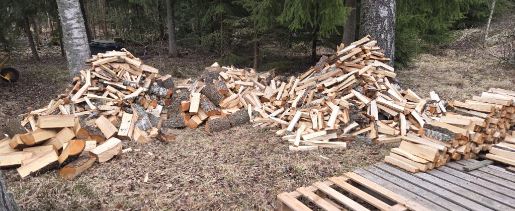 Perjantai olikin sitten pitkästä aikaa vapaata treeneistä. Ajelimme aamusta mökille, jossa tuli kaadettua kolme puuta. Kaksi niistä oli aikas mötkäleitä ja hieman jänskätti, että mitä sitä saa rikottua. Kaadot eivät nyt ihan täydellisesti onnistuneet, mutta aikas hyvin rungot löysivät paikan rikkomatta isommin mitään. No, yksi puska meni matalaksi ja jokusia oksia katkeili muista puista, mutta mökki ja muut rakennukset pysyivät ehjänä. Kaatojen jälkeen sitten karsimista, pätkimistä, kantamista ja halkomista. Harjoituspäiväkirjaan ei tullut merkintää, mutta Polari näytti että askeleita olisi tullut 39000. Mutta päivä oli kyllä komea ja tyyni, eli juuri sopiva puiden kaatoon.